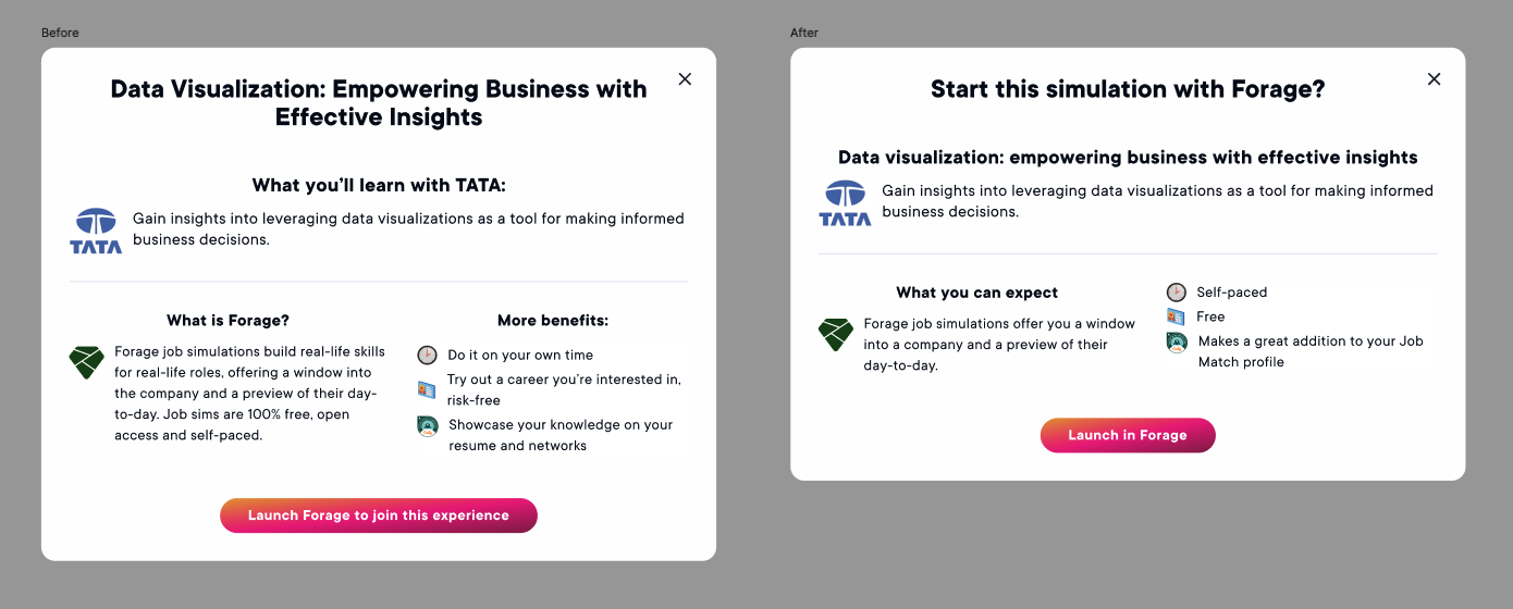 When a user chooses a Forage simulation in Job Match, we need to let them know that they’ll be leaving their current experience and set expectations for their next destination.